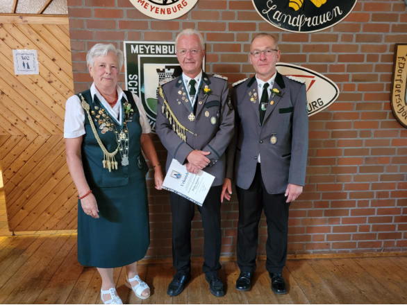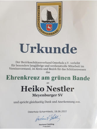 Neben seiner 50 jährigen Mitgliedschaft im Schützenwesen erhielt Schützenbruder Heiko Nestler Meyenburger Schützenverein e.V. eine besondere Auszeichnung. Der Bezirksschützenverband Osterholz e.V. ehrte damit eine langjährige und verdienstvolle Mitarbeit.
